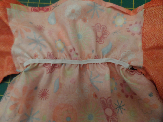 Вы видите, в свободное по покрою платье на уровне талии вшита резинка. Не в очень тугую натяжку, а чтобы придать платью мягкие складки. На струящейся ткани это выглядит красиво. Деталь платья (розовая его часть), в которую вшита резинка изображена на рис. 1.