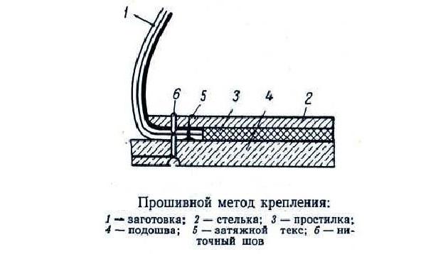 - Прошивной. Применяется при изготовлении повседневной и модельной обуви. Представляет собой соединение верха и основания с помощью прочной синтетической нити. Такой вариант считается презентабельным и достаточно прочным. На начальном сроке ношения так оно и есть. Но со временем происходит постепенное истирание прошивочного материала, прочность ухудшается. Другой минус технологии – пропускание воды через отверстия. Сегодня производители отказываются от данного способа крепления.