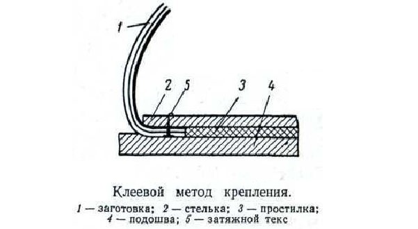 - Клеевой. Наиболее распространенный способ по причине дешевизны, простоты, надежности. Готовые изделия отличаются прочностью, износостойкостью, герметичностью. Минус заключается в сложности подбора клея для подошвы, так как для разных моделей используются составы, устойчивые к различной температуре.