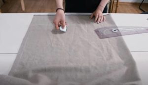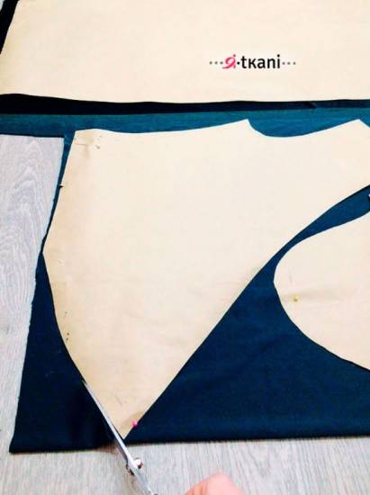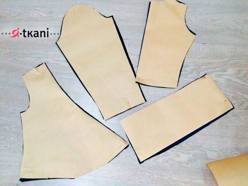 - Теперь вырежьте из бумаги выкройки и приколите к ткани булавками, обведите мелом;