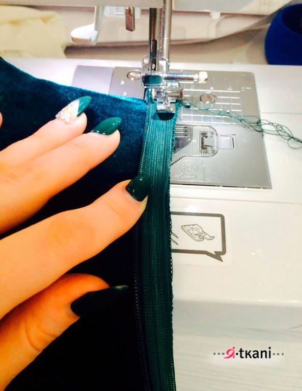 Предварительно смётываем основную ткань и подкладку. Края молнии вставляем в шов и вручную пришиваем к платью. Сшиваем юбку, разутюживаем припуски.